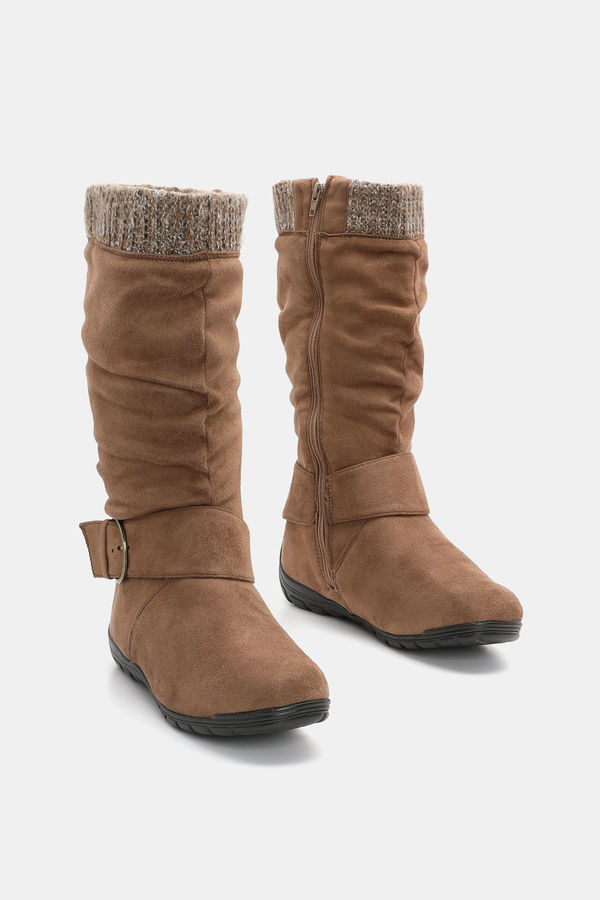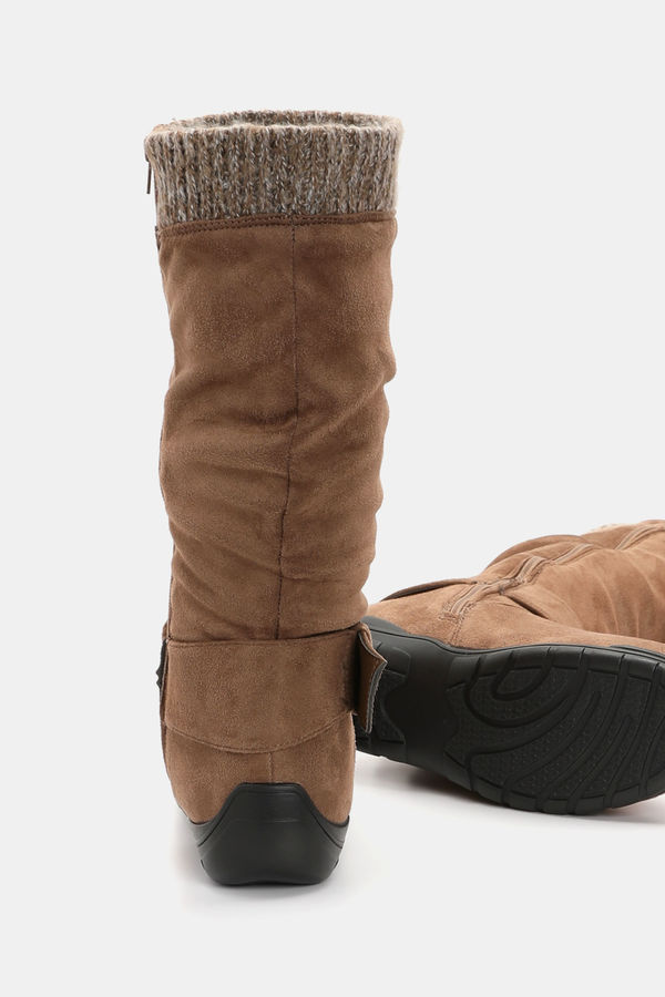 Mid-calf microsuede boots. Side zipper closure. Buckle detail. Knit collar. Faux sherpa lining. 3M Thinsulate insulation. Water resistant fabric. Comfort foam insole. Rubber outsole.
