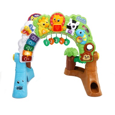 From sitting to crawling and standing, the Safari Learning Station™ grows with children while keeping them learning and entertained. The three-in-one arch adjusts for floor play to standing play and includes three different modes. Giraffe, Lion and Zebra introduce the ABCs and 123s while playing catchy safari-themed songs. Press the light-up piano keys to make music and discover shapes and colours. Little ones can spin Elephant's bead spinner for fine motor fun and twist Chameleon's tail to learn about colours. Children will also love dropping the balls through Monkey’s tail and watch as it rolls down the ramp, through the trees and back to them. Grow and learn on a safari adventure!