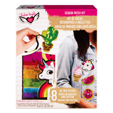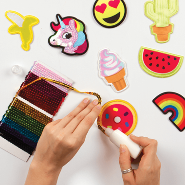 Design 8 too cool for school sequin patches that are on trend and no sew. Glam up a boring backpack or jean jacket and you can say you made these super sparkly patches. Easy and quick, using the enclosed glue and sequin strands, add a rainbow or unicorn and more to anything.