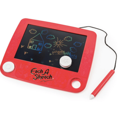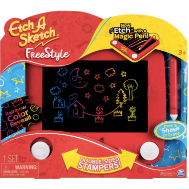 The next generation has a new classic to play with! Introducing Etch A Sketch Freestyle: a toy from the past transformed for the future. Designed exclusively for young artists, the Freestyle comes with a handy stylus that’s easy to grip and move. Kids can express their creativity without any messy clean up. Simply draw, shake to erase, and draw again – just like you did! Only now, your child has a whole new world of etching possibilities to discover. Alternate between thick and thin lines or use the double-sided stampers to add hearts, circles, stars and clouds to doodles. Since inspiration can strike anywhere, the classic red frame of the original has been flattened into a sleek and lightweight drawing pad. Throw it in a backpack and take it on a trip! Get creative, wherever you are, with the Etch A Sketch Freestyle!