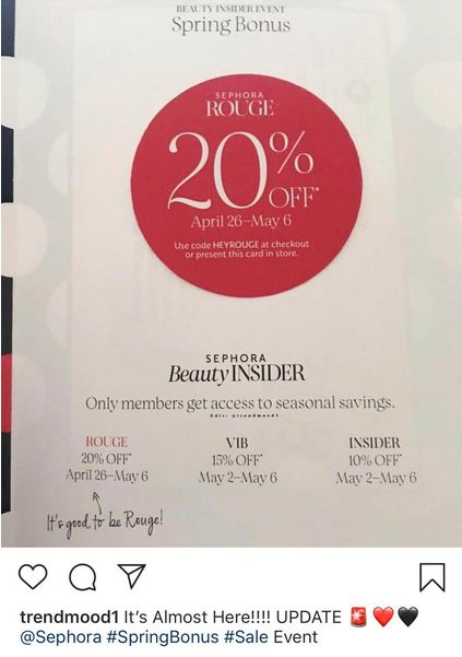 Sephora会员有三种,Insider、VIB和Rouge三个级别,消费累计$350的顾客可以从起步Insider升级为VIB会员,满$1000后升级为Rouge会员。通常Sephora每年在4月、11月打折两次,Rouge会员有提前入场扫货的优先权。