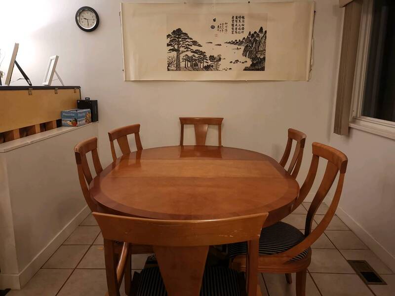 实木餐桌一套,一张餐桌与6张椅子,餐桌直径4尺122cm,可以加长至5尺半168cm。$480