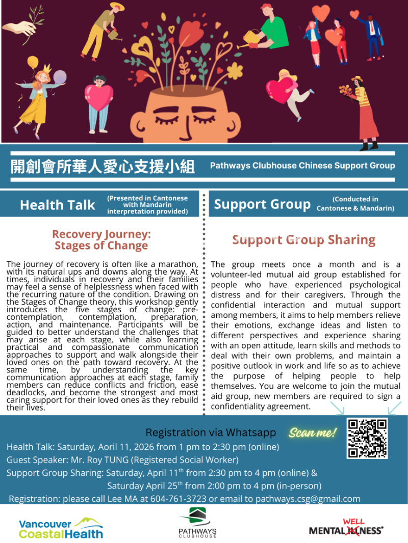各位朋友您好,诚挚邀请您参加开创会所 (Pathways Clubhouse) 华人爱心支援小组3月份的健康讲座及互助小组分享活动。