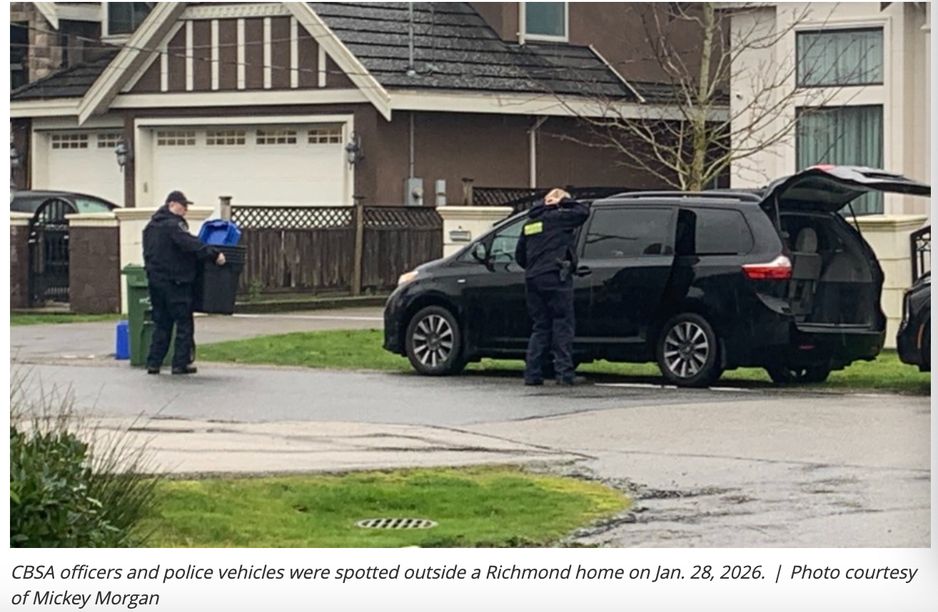 加拿大边境服务局(CBSA)和列治文皇家骑警(RCMP)周三上午出现在列治文一处住宅。 周三(1月28日),负责调查违反加拿大边境相关法律人员的CBSA刑事调查科,在列治文皇家骑警的协助下,对列治文一处私人住宅执行了搜查令。 一名附近的列治文居民看到,七辆CBSA和列治文皇家骑警的车辆停在Udy路上一处住宅门前,地点靠近2号路与格兰维尔大道一带。 该居民告诉《列治文新闻》,看到CBSA人员将桌子和“大型箱子”搬入屋内,并带着两个背包离开。 加拿大边境服务局表示,由于调查仍在进行中,暂无更多信息可公布。CBSA同时向居民保证,公共安全不存在任何问题。