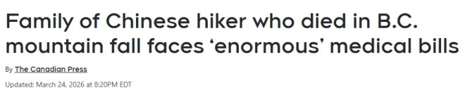 一场原本普通的登山活动,却酿成悲剧。 一名来自中国的男子在大温一座高山上为救同伴不幸坠亡,而他的家人如今不仅承受失去亲人的痛苦,还要面对高达数万元的医疗账单。 太平洋西北户外协会在一份在线声明中称,在卑诗省Lions Bay附近布伦瑞克山(Brunswick Mountain)约100米高处坠落的严岑(Yan Cen),“是在勇敢帮助另一名朋友时失去了生命”。 Lions Bay搜救队表示,这起事故发生在上周六,当时一支14人的登山队中,一名女子滑倒并坠落约20米。 随后,严试图下攀去协助她,但救援人员表示,他在陡峭且积雪的地形中也滑倒并继续坠落,最终停在一处瀑布上方。 Lions Bay搜救队的一名发言人证实,上周六被救出、并于次日不幸去世的男子,正是户外协会在线募捐页面中所提到的严。 募捐页面称,严的去世让家人悲痛欲绝,同时还要面对来自温哥华综合医院(Vancouver General Hospital)“难以承受的非居民ICU重症监护费用”。 温哥华沿岸卫生局(Vancouver Coastal Health)列出的数据显示,温哥华综合医院对非居民的重症监护费用为每天18,105加元。 “严岑是一位极其善良、充满热情的人,总是乐于帮助他人,”该协会在募捐页面中写道。 “他的突然离世让家人悲痛不已,同时也面临巨大且突如其来的经济负担。” 声明称,筹集的资金将用于医疗、葬礼及其他相关费用,截至周二下午已筹得约4.4万加元。 图源:GoFundMe 卑诗省验尸官服务处(BC Coroners Service)表示,目前仍在对该事件进行调查。 Lions Bay搜救队表示,周六的救援行动动用了绳索系统和两架直升机,“是一项复杂、困难且高风险的任务”。 该组织在社交媒体发文称:“这是一个极其悲惨的结果,我们向所有受影响的人表示慰问。” 救援团队表示,被救出的女性登山者情况稳定。