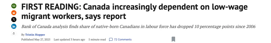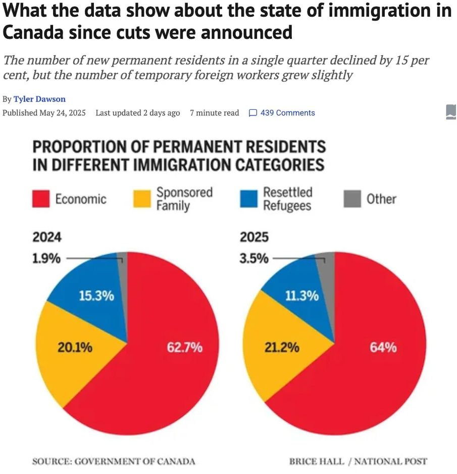 将2025年第一季度与20254年第一季度进行比较,虽新增永久居民数量下降了15%,但最大减幅是通过国际流动计划(IMP)入境的临时居民。