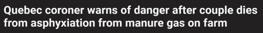 今天,一起“加拿大夫妇双双坠入粪池死亡”的新闻震惊了不少人,网友们都以为自己第一眼看错了:掉进粪坑?双亡?! 事情发生在加拿大魁北克省,住在蒙特利尔的圣克里斯汀(Ste-Christine)的一对夫妇经营着一个家庭农场。 这天,44岁的男主人带着工具箱,来到自家粪池修东西。 他经常自己动手修理家里和农场的边边角角,熟练地来到粪池边上,敲敲打打。 却没想到,短短几分钟之后,他就失去了意识,整个人倒在了池底。 女主人等了好一会儿,都没见丈夫下来,心下觉得不妙,立刻爬上梯子,试图施救。 不料,她没抬动丈夫,也昏厥了,整个人从梯子上摔落,最终压在丈夫身上。 两个人都失去了意识,应该是家人或邻居报了警,叫救护车,但急救人员赶到时,男子已当场身亡。 妻子虽然被紧急送医,但在医院与死神搏斗18天后,还是不幸去世了。 省尸检报告表明,两人都是吸入了粪池的剧毒气体昏厥过去的。 一般来说,化粪池里都有硫化氢(H₂S)、二氧化碳、甲烷和氨气等有毒气体。一旦浓度过高,几秒钟内即可让人晕厥,数分钟后便可能死亡。 由于这些气体无色无形,往往难以被察觉,粪池也被视为农业作业中的“隐形杀手”。 魁北克省验尸官南希·布沙尔(Nancy Bouchard)特别提醒,这种事故并不是个例,全加拿大都经常发生过类似案例,很多农民因为缺乏相关知识或防护设备,贸然进入粪池,最终葬身其中。 这对夫妇的家属表示,他们无法接受这个残酷的事实,怎么也没想到,一次日常维修竟演变为夺命事故。 邻居和朋友也回忆,这对夫妻在社区里的风评很好,大家都认为他们勤劳、善良,如今双双身亡,实在令人唏嘘。 “他们一直是那么小心谨慎,却没想到会死在自家农场。” 布沙尔建议,魁北克专业农民协会必须承担责任,明确讲解粪池的危险性,推广必要的安全规程,例如切勿单独进入粪池、佩戴防毒面具或呼吸器、保持通风等。 粪池是现代畜牧业常见的设施,用于收集牲畜粪便和尿液的混合物。 在厌氧分解过程中,会持续产生硫化氢等有害气体。 硫化氢在低浓度时仅有臭鸡蛋味,高浓度下却会麻痹嗅觉神经,使人无法察觉危险,更容易发生中毒。 据加拿大农业安全协会数据显示,每年北美都有农民因粪池气体中毒身亡。 2019年,美国一户家庭在短短一天之内,接连3名家庭成员相继坠入粪池,抢救不及,结果就是全死了。 这场夫妻双亡的惨剧,不仅夺走了两个鲜活的生命,也给社区敲响了沉重警钟。 “几秒钟的疏忽,可能就是一生的悲剧。”