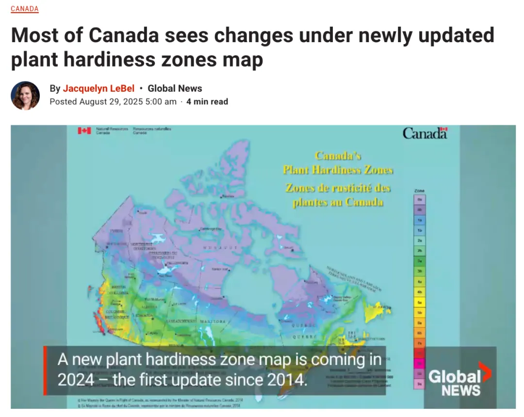 对于热爱园艺的加拿大人来说,一张最新的地图将成为他们明年规划花园的重要参考。加拿大自然资源部近日发布了最新的全国植物耐寒区分布图,这是自 2014 年以来的首次更新。     研究人员发现,在过去十年里,加拿大约 80% 的土地都显示出“耐寒区等级上升”,通常提高了半个等级到一个完整等级。这意味着,加拿大许多地区的气候条件已经发生了显著变化,能种的花草果树也随之更多。   什么是“植物耐寒区”?   通俗来讲,植物耐寒区(Plant Hardiness Zone)就是告诉大家:哪些植物能在什么地方存活。这张全国性地图的等级从 0 到 9,每个等级又分为 a 和 b 两个小区间,数字越高,说明当地冬天越暖和,植物能种得越“娇气”。   地图的绘制并非简单凭温度,而是基于过去 30 年的平均数据,涵盖了七项指标: 最冷月份的平均最低气温 无霜期天数 6 月至 11 月的降雨量 最热月份的平均最高气温 一月份的降雨量(因为降雨后骤冻对植物根系破坏极大) 最大积雪深度 三十年内的最大阵风   本次新地图基于 1991 年至 2020 年的气候数据,于今年 7 月正式公布。   安省园艺条件明显改善   在安省南部,多数地区的耐寒区等级相比上一次地图提高了半个等级。   加拿大森林服务局下属五大湖林业中心的研究科学家约翰·佩德勒(John Pedler)介绍说:“一个显著的例外是大多伦多地区。这个区域范围很大,涵盖了几个不同的等级,但整体上平均从 6A 升到了 7A。”   他解释,部分变化可能与“城市热岛效应”有关。另一位研究科学家丹·麦肯尼(Dan McKenney)补充道:“随着人口增长,混凝土和建筑物会在大城市中加剧热量,这种现象在气候科学领域已有研究。虽然我们不是研究这个的,但在我们的地图中,确实能看到这种效应的体现。”   除了多伦多,温莎地区的变化也很大,从 7A 升至 7B。“这是安省首次出现 7B。”佩德勒表示。   这意味着,在这些地区,居民可以尝试把美人蕉、大丽花当作多年生植物种植,而不是像过去那样只能当作一年生。佩德勒甚至建议,居民们可以尝试种植桃子、油桃,甚至无花果和石榴。   不过,麦肯尼提醒大家,地图只是一个平均参考:“植物是每天都在经历天气的。每一年都不一样,一个特别寒冷的冬天,可能依然会让这些植物撑不过去。”   对于有商业种植打算的农户,加拿大自然资源部还提供了更详细的物种模型,可以按具体地点查询某种植物的耐寒性,以便评估风险。   全国范围的变化   在加拿大西部和不列颠哥伦比亚南部及西北部地区,以及阿尔伯塔山麓,有些地方甚至上升了整整两个等级。   在主要城市中,变化最明显的包括: 维多利亚:从 7B 跃升至 9A,是全加最高等级,几乎只出现在维多利亚和温哥华周边。 温哥华:从 8A 升至 9A。 卡尔加里:从 3A 升至 4A。 温尼伯:从 2B 升至 3B。 多伦多:从 6A 升至 7A。   不过,也并非所有地方都在升温。纽芬兰东部的部分地区反而下降了半个等级。佩德勒解释说:“目前的理论是,气候变化导致北大西洋的冰山数量增加,更多冰山通过‘冰山走廊’南下,反而带来了一定的降温效应。”   气候变化的隐忧 虽然耐寒区上升让很多园艺爱好者对“新鲜的种植机会”感到兴奋,但科学家们强调,这背后其实是气候变化带来的更严峻问题。   佩德勒指出:“这种变化很可能是气候变化推动的。更长、更强烈的森林火灾季节已经在加拿大北部出现,而未来预计还会带来更多严重的负面影响。”   加拿大的耐寒区地图与美国农业部的版本不同。美国的地图主要参考极端低温,而加拿大则考虑了积雪和降雨等因素。麦肯尼解释:“他们的方式适合美国,因为不是所有地区都会有厚雪。但在加拿大,积雪覆盖对植物的影响非常大。”   目前,加拿大自然资源部官网(https://planthardiness.gc.ca/?m=1)提供了互动版耐寒区地图,市民可以对比1961-1990、1981-2010 和最新的 1991-2020 数据,清晰地看到气候的变化趋势。