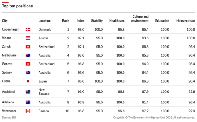 经济学人智库(EIU)最近发布了《 2025年全球宜居指数》,温哥华成为北美唯一进入前十的城市。但排名第10,算是险入前10。 (来源:Economist Intelligence Unit) 经济学人智库是《经济学人》杂志的姊妹机构,它根据医疗保健、教育、稳定性、基础设施和环境等多项因素对全球 173 个城市进行了排名。 今年这份排名相比去年有了不少的变化,最显著的变化就是在榜单上连续三年位居榜首之后,奥地利首都被“美妙绝伦的哥本哈根”击败。 经济学人智库副行业总监巴尔萨利·巴塔查里亚 (Barsali Bhattacharyya) 在一份声明中表示:“全球宜居性在过去一年中保持平稳,与 2024 年一样,全球范围内的稳定性得分有所下降”。 哥本哈根在稳定性、教育和基础设施方面获得“满分”评分,夺得桂冠,维也纳则与瑞士城市苏黎世并列第二。 维也纳排名下降的主要原因是稳定性评分的“急剧下降”,这归咎于去年夏天泰勒·斯威夫特演唱会上发生的炸弹威胁,导致该活动被取消。 榜单中,澳大利亚墨尔本仍位居第四,瑞士日内瓦则位居第五。 澳大利亚悉尼排名上升,从并列第七位跃升至第六位,而日本大阪和新西兰奥克兰并列第七。 阿德莱德位列第九,是第三个进入前十的澳大利亚城市,加拿大温则位列第十。 维也纳并不是唯一一个在之前得分较高的类别中排名下降的城市,卡尔加里在 2024 年的排名中位列第五,但今年却跌出了前十名。 与其他三座加拿大城市一样,由于国家医疗保健系统的“压力”,卡尔加里的医疗保健得分较低,导致排名跌至第 18 位。 多伦多今年的排名也下降了,从第 12 位跌至第 16 位。 这使得温哥华脱颖而出,不但是加拿大最宜居的城市,也是北美最宜居的城市。 巴塔查里亚强调,世界其他地区也面临着医疗体系和住房基础设施的压力,但加拿大因这些因素的持续影响而“脱颖而出”。 美国没有任何城市进入最宜居城市前十之列。夏威夷檀香山是榜单上排名最高的美国城市,位列第 23 位。 “我们发现了一种趋势,美国的中小型城市实际上比纽约或洛杉矶这样的大城市表现要好得多”,巴塔查里亚解释道,“这主要是因为公共服务基础设施的压力”。 西欧城市也出现在2025年排名下降幅度最大的城市名单中。由于大规模骚乱和无家可归者人数上升,英国所有城市(伦敦、曼彻斯特和爱丁堡)的排名均有所下降。