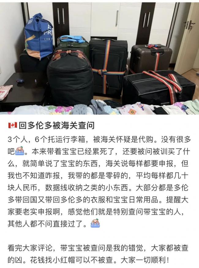 暑假快到了,很多在加拿大的华人都准备出国旅行或者回中国探亲。但是旅行回来后入境加拿大一定要注意物品申报和税务问题。 就在昨天,有华人一家就在多伦多落地时被海关拦截并且开箱查验!结果是被海关提醒:这些“零碎”的,常被认为不需要申报的东西其实也必须悉数报关。 根据小红书网友小A自己讲述的经历,她一家3个人带着6个托运行李箱落地多伦多,随即被海关怀疑是代购并且拦截下来“被问被训”买了什么。     小A就简单说了宝宝的东西。海关提醒说每样都要申报,但小A也不知道咋报,都是零碎的,数据线收纳之类的小东西平均每样都几十块人民币。   大部分都是多伦多带回国又带回多伦多的衣服和宝宝日常用品。 有网友评论说:“但凡申报了就不查啊。大人离境一周以上可以带回$800加元约¥4000多人民币的免税商品(Absence of more than 7 days You can claim goods worth up to CAN$800)。2个大人加起来肯定够用了。只需要报在境外买的。自己带走的不算,因为在加拿大加国税了。” “申报金额直接拉满没被问过。” 对于免税额度大家都没有异议,但是免税部分是否要申报就有很多人闹不明白了。 “不是$800以上才需要申报么?” “我一直以为是这样。是某个超过$800(的商品)才申报。” 根据加拿大边境局官网消息,离境24小时以内、超过24小时、超过48小时、超过7天可以携带入境的免税额度分别为:$0、$200、$800和$800。 从官网给出的消息来看,$800以内只是免税额度并不是免申报。如果有符合规定的商品,大家一定要记得如实填写报关单啊! 虽然没造成严重后果,但小A还是想借助自己的经历提醒广大华人出入海关一定要注意遵守相关规定。