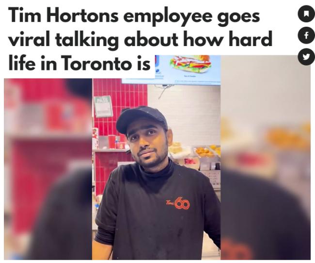 最近,多伦多一名Tim Hortons员工因"痛骂多伦多"而走红网络。 这段由@reedinthestreet上传的视频围绕多伦多居民目前所面临的一些困境展开讨论,特别提到了不断上涨的生活成本和租金,在短短几天内就获得了成千上万的点赞和评论,引发了关于在多伦多生活的“梦想”与“现实”的讨论。 视频中这位来自孟加拉国的Tim Hortons员工已经在多伦多生活了大约6个月。他坦言:“从很多不同的方面来看,这个地方太疯狂了。”他解释说:“我很庆幸我是从Tim Hortons开始工作的,所以我能看到许多加拿大没有向世界展示的东西。” 这位小哥声称,在这家国民咖啡连锁店工作期间,他看到很多为了生计而苦苦挣扎的人,甚至有一些言谈举止像大学教授一样的顾客竟然是流浪汉。 他说:“老实说,这个地方真的糟透了(f***ked up)!我知道我不该用这个词,但这个地方真的是一团糟。” “在多伦多,人们很容易无家可归,因为房租太高了,人们如何才能负担得起呢?”   当被问及是否想过回国时,这位小哥回答说:“我以前总是想,我有朝一日肯定会回去的,我赚了钱就回去。但是现在我的想法是,我必须回去!必须回去!!!” 随着这段视频在社交媒体上疯传,引起网友们激烈讨论。一些网友承认,面对这座城市竞争激烈的就业市场和高昂的租金价格,无论是新移民还是长期居民都面临着种种困难: “多么可爱的家伙。他说的太对了!人们都被广告宣传中的加拿大骗了,那并不是真实的。” “加拿大正在走下坡路,但多伦多可能是全国最糟糕的例子和最不适合居住的地方。” "国外的人们需要听到这些!因为是真的,这个国家一团糟,它不是充满机会的美好国度。" “加拿大梦在2015年逝去了...” ”特鲁多把尽可能多地摧毁加拿大人的生活视为自己的使命。” 另一段由@Canada Tried and Tested上传的类似视频也在社交媒体上引起热议,发布者坦率地讨论了高技能移民来到加拿大后高面临的一些挑战,包括经济压力和难以找到相等水平的工作。 加拿大联邦政府在去年12月宣布的涉及留学生的新政策中,提高了对学签申请人的资金要求,以更好地反映在加拿大生活的实际情况。 根据最新的要求,从2024年开始,申请人需要证明除了拥有第一年的学费之外,还需要有20.635元的存款,比之前要求的1万元增加了一倍。这相当于加拿大统计局每年更新低收入标准(LICO)的75%,或者说确保一个人在生活必需品上花费较少的情况下生存所需的最低收入。
