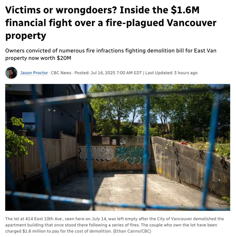 其中位于本拿比的一块空地,曾在 2009 年和 2013 年先后发生火灾,迫使 100 名租户撤离。CBC 调查发现,该地块也屡次收到本拿比市府发出的违规通知,目前仍是荒废状态。