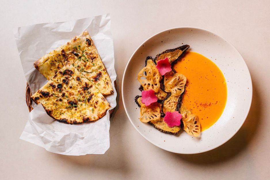 一些菜单特色包括:香蕉馅饼与椰子辣椒黄油、鸡肉烤串酿羊肚菌(配有咖喱酱和绿豌豆)和 Puran Poli(牛奶蛋糕、法式酥饼、酥油和辣椒脆片)。