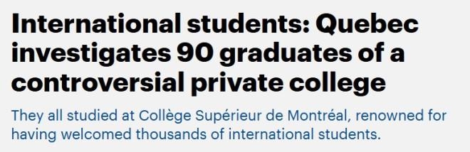 魁北克政府正在调查一所备受争议的蒙特利尔私立学院Collège Supérieur de Montréal(CSM)的90名毕业生,以核查他们的文凭是否真实有效。 今年夏天,省移民与法语化部(MIFI)传唤了数十名正在申请永久居民的该校毕业生进行面谈。在寄给学生的信件中,该部门表示,他们“有理由相信申请中包含虚假或误导性信息或文件”。 面谈之后,至少有两名学生因与实习相关的陈述问题而失去了魁北克甄选证书(CSQ),其余88个案例仍在审查中。   拿到魁北克甄选证书,是通过魁北克的移民项目拿永久居民的第一步。失去证书就意味着将失去移民的机会。   魁省移民部门的发言人在电邮声明中表示:“当申请中出现疑点或不一致之处,移民部有权进行深入调查。” 学院方面则回应称,移民部核查部分国际学生的档案“完全合理”,并强调这些检查“针对的是个别申请人的档案,与学院课程本身的合规性无关”。 魁北克教育部门也表示,他们“已经知悉相关指控”,并已启动相关调查程序。 涉伪造实习报告 近几年,蒙特利尔私立学院CSM依靠可通往永久居民的短期课程吸引了成千上万名国际学生。 去年,调查团队曝光CSM录取了多达1.2万名外国学生,超过任何大学或公立学院,而校方并没有足够的教学场地容纳这些学生。 2023年,加拿大广播公司(Radio-Canada)还揭露,有学生填写了与“虚构医院”有关的虚假实习报告。 被查学生陷入迷茫与恐慌 在核查行动中,不少自称完全合规的毕业生如今陷入焦虑,不知该向谁求助。 阿尔及利亚学生Yasmine(化名)说,她学的是医疗秘书专业,6月4日接受了近2小时的盘问,被问到实习地点的墙壁颜色、使用的软件、2022年任课老师的名字等细节,但至今仍未收到任何回复。 另一名毕业生Rima(化名)也被传召面谈。她说:“调查员明显对我施压,说她怀疑我提供的文件和实习经历不是真实的。” Rima目前在魁北克一所大学工作,但她的工签将于12月到期,她担心因调查延误而失去合法身份。 她说:“我感到非常不公平。”因为她的多名同学已经顺利拿到了永久居民。 据报道,这所被突查的私立学院由魁省教育厅认定并提供补贴,在2024-2025学年共有约3300名国际学生。学校主要开设会计、秘书、电脑技术等 DEP、ASP 短期职业课程,其毕业文凭可直接申请毕业后工作许可(PGWP),对许多留学生来说,这是走向魁省移民(PR)的关键一步。
