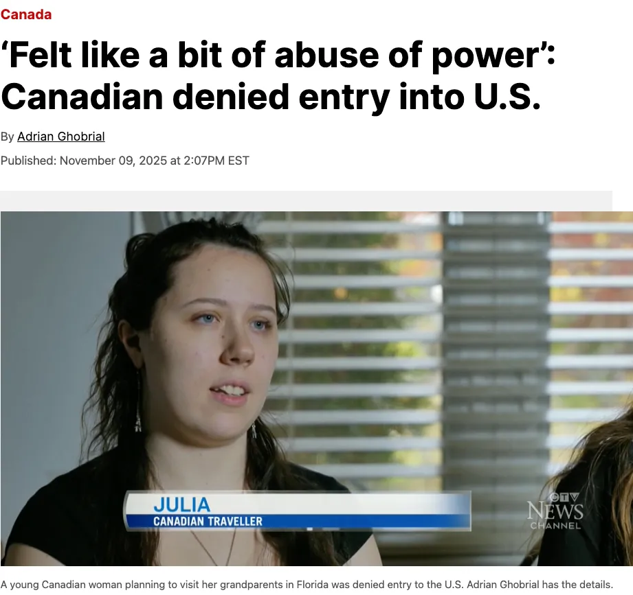 多伦多地区一名20岁女孩持加拿大护照准备飞往美国探望祖父母,结果在多伦多皮尔逊国际机场被美国海关官员拒绝入境,称她有移民倾向,“企图非法移民”,气得这位女孩说不出话,称她“根本不想去美国生活。” 这位名叫朱莉娅(Julia)的女孩一脸困惑地告诉CTV新闻,11月3日,她带着行李和有效的加拿大护照抵达多伦多皮尔逊机场。 她说她购买了Porter Airlines的往返机票飞往奥兰多,期待着在佛罗里达州度过六周的假期,好好放松一下,并与祖父母共度美好时光。 结果,震惊的事情发生了,朱莉娅被拒绝入境美国,机场的美国海关官员认为她“企图非法移民美国”。 她的母亲凯特(Kate)接到女儿被困在机场的电话时感到非常震惊。 “说实话,这感觉有点像滥用权力,”凯特说。 朱莉娅这位20岁的女孩正在休学,直到明年春天才能返校,她像许多年轻的加拿大人一样,找不到工作。 因此,她决定利用这段时间去美国旅行,但她的计划很快就被海关官员打断了。 朱莉娅说,她排了一个半小时的队,才轮到她走到皮尔逊机场的美国海关预清关柜台,回答几个标准问题。   然而,她很快发现美国移民官对她产生了怀疑。 “他们决定把我标记出来,带我到另一个房间,”朱莉娅说。 她说她开始担心会错过航班。 “我开始有点喘不过气来,因为我担心会发生什么事。然后他们告诉我,我被拒绝入境美国,”朱莉娅说。 朱莉娅收到了一份美国国土安全部的检查清单。清单上,一名海关官员注明朱莉娅没有提供回程机票证明,尽管她向CTV新闻出示了行程单以及波特航空公司(Porter Airlines)的回程机票,朱莉娅说她已经向海关官员提供了回程日期。 她说,海关还要求她提供在加拿大的工作和学习证明,但她无法提供,因为她目前失业,正在休学。 当CTV新闻问她是否有任何移民美国的计划时,这位多伦多女孩毫不犹豫地表达了自己的感受。 “我根本就不想去美国生活,”她说。 朱莉娅说,这次令人不快的经历让她感到震惊。 尽管她在二月份探望祖父母时一切顺利,但她现在担心自己可能无法再次去美国探望祖父母。 与此同时,波特航空公司得知朱莉娅的遭遇后,联系了她的家人,并全额退款。 母亲凯特认为她女儿的经历是所有加拿大人都应该了解的。 她说:“我希望其他人不会遇到这种情况。这太令人不便了。” “这不仅会造成经济损失,还会造成情感上的伤害。如果我们的故事能帮助其他家庭避免这种情况,那就太好了。我认为很多人都在抵制去美国旅行,经历过这件事之后,我完全赞同这种做法。” 移民律师希瑟·西格尔(Heather Segal )告诉CTV新闻,加拿大公民被美国海关官员拦下的情况越来越频繁。 塞加尔说:“美国移民局听命于上级,当美国国内反移民情绪高涨时,他们就会滥用职权,以负面方式行事。” 塞加尔说,近几个月来,她接到许多加拿大人的反映,称他们在入境时“被问到更多关于旅行目的的问题,并被要求提供更多文件”。 塞加尔说:“有些人甚至在接受询问时被滞留在二次检查区更长时间。” 移民律师表示,加拿大人在试图进入美国时应该做好应对意外情况的准备。 律师建议,如果您要去美国参加婚礼或其他活动,请随身携带邀请函或门票,确保您有回程机票证明和酒店预订信息。 塞加尔说:“加拿大和美国之间的一些政治问题会在边境体现出来。” “这些因素导致这位年轻女性在进入美国时遇到了麻烦。尽管她没有做错任何事,但在边境地区,人们对她的怀疑程度更高。”