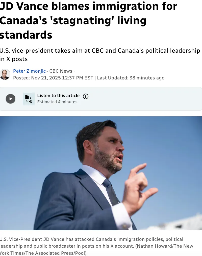 美国副总统约翰·迪·万斯(JD Vance)发表了一系列帖子,批评加拿大的政治领导层、公共广播机构和移民制度,称由于大量“外来人口”涌入,导致加拿大的生活水平“停滞不前”。 周五,万斯在其X账户上发帖称,加拿大民选领导人过分强调多元化,造成了“移民乱象”。 他写道:“虽然我确信个中缘由错综复杂,但没有哪个国家比加拿大更热衷于‘多元化是我们的优势,我们不需要熔炉,我们只需要沙拉碗’这种移民乱象。” 该帖子包含一张来自冰帽资产管理公司(Ice Cap Asset Management)的图表,显示了从 2016 年初至今加拿大、英国和美国的生活水平增长情况。 万斯周五早上发帖称:“加拿大是G7中外来人口比例最高的国家,但其生活水平却停滞不前。” 冰帽资产管理公司的一位金融分析师理查德·迪亚斯(Richard Dias)在该帖子下评论了一个字,表示他“同意”。 该图表并未详细说明用于衡量这三个国家生活水平随时间变化的增长率的具体指标。 CBC新闻已致函该公司,要求提供更多关于所用指标以及移民政策所起作用的详细信息,但尚未收到回复。 万斯还表示,任何认为加拿大当前生活水平低下是由于美国贸易和经济政策造成的这种说法都是彻头彻尾的谬论。 “恕我直言,我的加拿大朋友们,你们的政治关注点完全集中在美国身上:你们停滞不前的生活水平与·特朗普或CBC告诉你们要怪的任何‘替罪羊’都毫无关系,”他说。 万斯称:“问题在于你们自己选出的领导层。” 在前总理贾斯汀·特鲁多领导的政府时期,由于疫情后劳动力短缺导致移民数量迅速增长,政府开始削减移民数量。 在马克·卡尼总理就职之前,自由党已经表示,他们的目标是降低临时居民在加拿大人口中所占的比例。 在预算案公布前,财政部长商鹏飞表示,政府的目标是将移民数量控制在“更可持续的水平”。 他说:“我认为加拿大人明白,我们已经达到了接收新移民的极限,有时甚至超过了我们的极限。” 预算案还指出,加拿大明年计划仅接收38.5万名临时居民,比2025年的目标减少约43%,并在接下来的两年内接收37万名。 2026年的目标比去年公布的移民计划减少了约四分之一,该计划曾表示加拿大将接收超过51.6万名临时居民。 去年,新移民的失业率为11.1%,约为加拿大出生人口失业率的两倍。加拿大统计局的数据显示,与加拿大出生的同龄人相比,移民更有可能从事“与其教育或培训无关”的工作。 加拿大移民、难民和公民部长莉娜·梅特莱格·迪亚布的办公室拒绝就万斯的帖子发表评论。 迪亚布的办公室表示,自由党政府“正在恢复对移民系统的控制”,使其“恢复到可持续水平”。 迪亚布的办公室在一份电子邮件声明中表示,加拿大将重新调整移民政策,以吸引全球“最优秀、最聪明的人才”,从而“填补高需求职业的关键劳动力缺口……同时使移民目标与社区承载能力相匹配”。