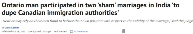 一名安省男子承认曾参与两桩“假结婚”帮助印度女子移民加拿大、并收取现金与服务作为报酬,如今他却在法庭上败诉,未能证明自己与三名孩子的母亲存在合法婚姻关系。   图源:51记者拍摄   辛格·西杜(Amratpal Singh Sidhu)向安省高等法院申请宣告他与阿曼迪普·考尔(Amandeep Kaur)为合法夫妻,而考尔则坚称两人根本不算夫妻,希望法官判定他们“没有结婚”。   法官伍德(Frances Wood)在判决中写道:“他公开承认曾为牟利、并为欺骗加拿大移民机构而参与了两次‘假结婚’。”   法官又指出,西杜多年以来在报税及房地产交易中都声称自己是单身,并借此在转让房产时绕过配偶同意的要求。   另外,双方均未解释为何婚姻状态对他们如此重要。   但法官指出,由于西杜提出了“财产平衡分配”(equalization)要求,因此可以推断其意图在于婚姻关系的法律效力。因为如果双方并未合法结婚,他便无权提出该项主张。   1997年的印度婚礼与“假结婚”历史   法院得知,西杜与考尔当年都在多伦多皮尔逊国际机场工作,并同意一同前往印度举行婚礼。双方一致承认,他们于1997年12月4日在印度参加了传统婚礼仪式。   但在该次婚礼后不久,西杜立即前往附近城镇参与另一场他称之为“假结婚”的仪式。   他声称,自己是在母亲得到照顾的交换条件下,与该名女子卡拉姆吉特·考尔(Karamjit Kaur)假结婚,以协助她移民加拿大。   这段婚姻后来于2001年在安省正式离婚。法官指出,尽管西杜称此婚姻为“假结婚”,但该婚姻却在安省得到正式承认,而他与阿曼迪普·考尔之间从未在安省或印度进行登记。   同时,印度《印度教婚姻法》并不允许一夫多妻,因此西杜不可能同时与两名女子维持合法婚姻。   判决显示,西杜在2022年再次前往印度,并参与另一场“假结婚”,对象为哈吉特·考尔(Harjit Kaur),同样旨在帮助对方移民加拿大。该次婚姻亦拥有正式的结婚证书,但加拿大当局最终未承认其有效性。   双方就此次假婚事件互相指责:西杜称哈吉特·考尔是阿曼迪普·考尔的表亲,而阿曼迪普·考尔曾被承诺获得4万加元以协助移民程序。他还声称她与孩子们出席了“婚礼”。而阿曼迪普·考尔则坚决否认。   双方多年互称单身,婚姻无正式记录   法官指出,从2000年至2017年,西杜在报税及房地产文件上多次“自称单身或同居关系”。阿曼迪普·考尔在2018年的报税中称自己“已婚”,但其他年份均填报“单身”。   考尔试图辩称两人关系“断断续续”,并非持续同居,但她也并不否认在某些时段同住。   双方育有三个孩子,但法官强调,这并不影响对婚姻合法性的判断。   法院最终裁决:两人从未合法结婚   法官对双方的诚信度均表示严重质疑,并指出:“任何一方都不能依靠自身的欺诈行为来证明婚姻的有效性。”   法院最终作出结论:两人于1997年回加拿大时均向不同机构申报为“单身”,从未为印度婚礼取得任何正式登记文件。西杜紧接着与另一名女子在安省登记结婚并获得离婚,这才是法律承认的婚姻。因此,法官裁定:双方在1997年于印度举行的婚礼不具法律效力,他们从未在安省形成合法婚姻关系。