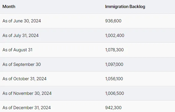 根据最新数据,截至2024年12月31日,加拿大移民、难民和公民部 (IRCC) 的积压申请数量为942,300份。