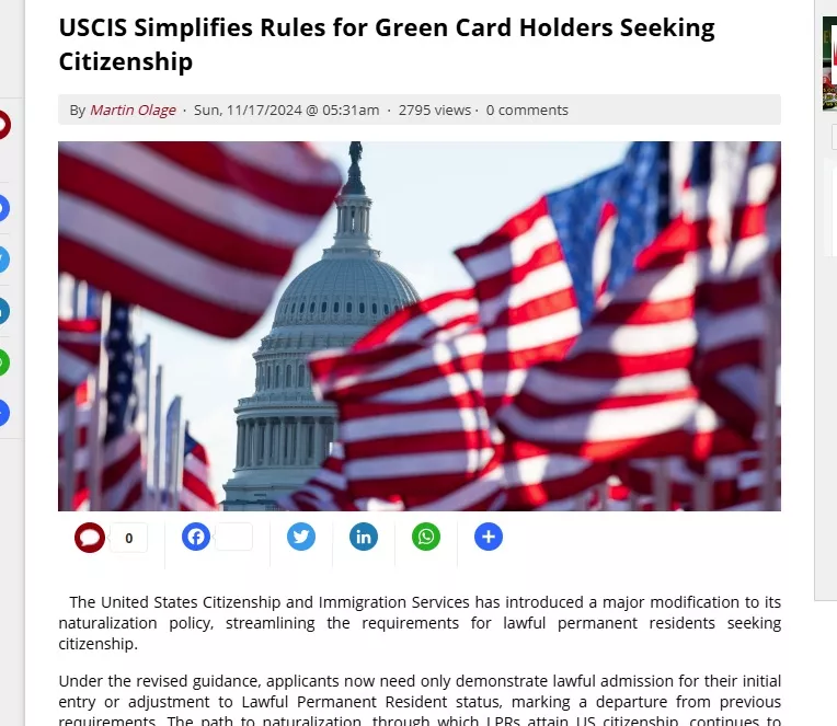 美国公民及移民服务局(USCIS)最近对其政策做出了重要修改,简化了合法永久居民(LPR,取得绿卡者)的入籍程序。 这一更新澄清了移民何时必须证明他们以美国永久居民身份合法入境美国。在新规定之下,仅审查他们的初次入境。 在此次更新之前,申请入籍美国的移民必须证明他们每一次入境或再次入境美国时,都是合法进入美国的。这很令人困扰,尤其对于那些经常出国旅行,并多次出入美国的人来说。 根据新政策,美国移民局只会审查首次入境,以及取得合法永久居民(LPR)身份时,手续是否合法。在此之后的任何旅行或再次入境,都不需再次证明自己是合法入境。 新政策与2024年法院在“Azumah诉USCIS ”一案中的裁决相一致。法院裁定,要求移民出具每次入境时的合法入境证明,会造成不必要的障碍,而且美国移民法也不支持这一要求。 因此,移民局更新了《政策手册》,以反映这一法律先例,并使程序更加清晰和公平。 本政策变更公布于2024年11月14日,此后提交的所有申请都适用新规。新规则减少了合法移民的困惑、文书工作和不必要的审查。 如果你是合法永久居民(LPR/绿卡),并准备申请美国公民身份,这一变化对你来说是个好消息。 如果你合法入境美国,并通过亲属、庇护或就业,将您的身份调整为绿卡持有者,且手续是合法的,就符合这一要求。 如果你在获得绿卡后,进行了国际旅行并返回美国,移民局在审查您的入籍申请时,以后不会要求您提供这些再次入境的合法入境证明。 成为美国公民是许多人的梦想,如果你计划申请入籍,可检查你的绿卡历史,确保您的初次入境或调整为LPR身份是合法的。 虽然不需要证明每次重新入境都是合法入境,但仍需满足其它入籍要求,如连续居住时间、良好的道德品格,以及通过英语和公民测试。