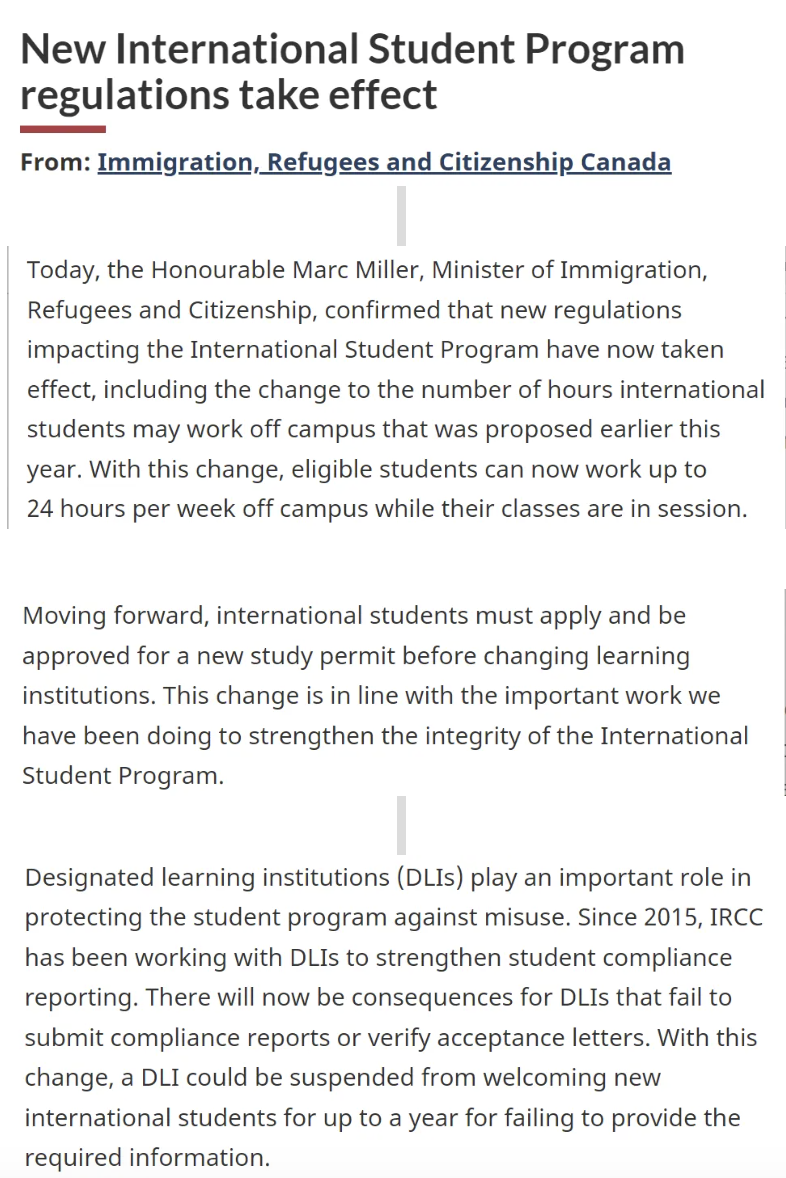 今年7月加拿大移民部预告的学签由“开放”转“封闭”终于落地了。不管是大学留学生、还是中小学留学生,转学都要注意了。 11月15日,加拿大移民部(IRCC)在官网发布三则重要信息:   1.留学生校外合法打工的时长调整为每周不超过24小时(寒假、暑假等学校放假的时间可以不受时长限制); 2.留学生在更换学习机构(转学)之前必须申请并获得新的学签(study permit)。 3.强化指定学习机构(DLIs)监管。IRCC将对未提交合规报告或未验证录取通知书的DLIs实施惩罚措施。这些机构可能会被暂停接收新国际学生长达一年。   新规自宣布之日起即刻生效。 图自:加拿大政府官网     在发布新规的同时,移民部强调了以下五大事项:         1.国际学生如需校外工作,必须全日制学习至少六个月的学术、职业或专业培训项目(魁北克省的职业培训项目也包括在内),且项目需获得学位、文凭或证书;         2.符合资格的学生可在学业期间的假期(如暑假或学期间冬假)全职工作;             3.指定学习机构(DLI)每年需向IRCC提交两次报告,说明学生是否保持在校状态。未保持注册的学生可能面临调查及执法措施;    4.魁北克省的DLIs目前尚未参与合规报告,IRCC与魁北克政府将花时间建立这一系统,因此魁北克DLIs享有暂时的宽限期; 5.自2023年12月1日推出录取通知书验证系统以来,截至2024年10月6日,IRCC已接收了近52.9万份录取通知书,其中近49.2万份被验证为有效,而超过1.7万份因与指定学习机构信息不符或已被取消而被识别为无效。 也就是说,即日起“跳签”成为历史,很多留学生眼中可以先上车后买票的时代结束了。此前,一些留学生会通过好学校和对口专业来增加学签成功率,拿到学签后在加拿大境内“跳签”到目标学校。新规生效后,这个漏洞被彻底堵上了。 在“转学”页面上,移民部也作了相关说明: 从2024年11月8日起,凡是就读高等教育类院校(学院、大学等)的留学生,在转学时不可继续沿用原有学校的学习签证,必须申请新的学习签证。 作为中小学生的留学生转学,以下六大事项要注意: 1.留学生从小学升学到中学:只要学签未过期,留学生都不需要申请新的学签,除非获批的学签上规定只能就读特定学校; 2.中小学留学生转学:只要学签未过期,留学生都不需要申请新的学签,除非获批的学签上规定只能就读特定学校; 3.高中12年级留学生升学到高等院校(学院、高等教育机构或大学):留学生需要申请新的学签; 4.留学生从高等院校降级到中学:留学生需要申请新的学签; 5.在同一所高校升学(如从专科到本科,或本科到硕士):只要学签未过期,留学生不需要申请新的学签; 6.在不同的高等院校之间转学(包括去别的学校读更高学历):留学生必须要申请新的学签。 作为大专学生转学,以下事项要注意: 1.如果申请正在处理中,可以通过IRCC的webform提交新的录取通知书和省或地区证明信(如果需要)告知移民部需要更改申请中的DLI 。 2.移民部可能会要求申请人确认学生身份。 如果申请人有学签,可能会收到移民部的电子邮件。电子邮件地址以“@cic.gc.ca”结尾。申请人必须在指定日期之前按照该电子邮件中的说明进行操作,以确认已在加拿大注册并积极学习。 3.转学的目标学校需要满足以下基本条件: 在指定教育机构DLI的名单上 ;          不在停学名单上 。   4.豁免条件:  A.在收到新学校的录取通知书后一直待在加拿大;     B.符合之前的学习许可的条件; C.学校出现变故,例如:学校倒闭;课程或专业被取消;学校被列入停学名单; D.学校失去教学资格。 也就是说,只有满足以上条件的申请者才可以在等待新学签申请的过程中直接开始在新学校的学习。 移民部警告称,如果你转学了,却未告知移民部,原学校会将你报告为未注册或未入学。如果发生这种情况,那么: 你违反了学习许可的条件;           除非符合上述情况之一,否则你的学签可能会失效;           学签可能会被取消;           你可能会被要求离开加拿大或改变你的身份;           这可能会阻止你将来再次来加拿大。例如,将来可能不会获得其他学习或工作许可。