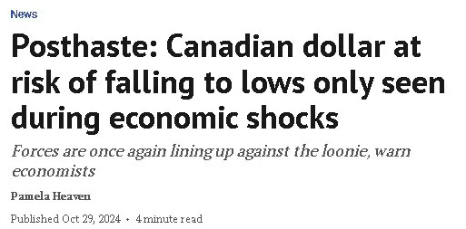 经济学家警告称,受一系列不利因素的影响,加元汇率有可能继续下跌,至仅在重大经济冲击期间才见到的低点。   图源:51记者拍摄   加拿大央行本月下调利率0.5个百分点,进一步拉大了与美联储的利率差距,这使加元受压。   BMO资本市场的加拿大利率与宏观策略师Benjamin Reitzes指出,美联储在9月份大幅降息,但美国经济的韧性表明美联储可能不会如预期般继续宽松政策。   另一方面,加拿大经济没有显示出增长动力,表明未来可能会继续降息。   丰业银行分析师Hugo Ste-Marie的报告指出:“加拿大央行似乎准备不惜一切代价重振经济,下次议息会议上可能进一步激进降息。另一方面,美联储不太可能重复9月份的50个基点降息。”   “现在我们看到两家央行都在同一个方向:一个在慢走,另一个在快跑。”   Ste-Marie表示,目前两国的政策利率差距达到了125个基点,是至少20年来的最大差距,而且在未来几个月可能会进一步拉大,这将对加元是更大的压力。   Reitzes指出,渥太华近日宣布大幅削减移民指标,可能会冷却通胀,特别是住房领域的通胀,同时放缓经济增长,从而推动加拿大央行进一步降息。   此外,还有美国大选。共和党候选人特朗普承诺的关税政策以及与加美贸易摩擦,可能会对加拿大经济和加元带来不利影响。   如果选举结果出现混乱,这种情况并非不可能,加元也将受到冲击,因为市场会避险逃离风险资产。   Reitzes表示:“市场已经在消化两国政策的显著分化,我们不排除在这方面可能会进一步加剧。不幸的是,这使加元面临风险,可能跌至过去几十年来仅在重大经济冲击中才见到的低位。”   目前,加元兑加元汇率为1加元兑0.72加元:   图源:XE   加元兑人民币汇率为1加元兑5.13元人民币:   图源:XE   但如果突破这一区间,Ste-Marie及其团队认为,加元可能会重探过去20年接近0.68加元的低位,类似于2016年和2020年的水平。报告指出:“坦率地说,我们希望这个预测是错的。”   “虽然较弱的加元确实会有利于出口商,并为多伦多证券交易所的收益带来小幅提振……但更弱的货币对加拿大企业投资于机械设备和信息技术的帮助不大,而这些进口商品对解决加拿大生产力低下问题至关重要。”