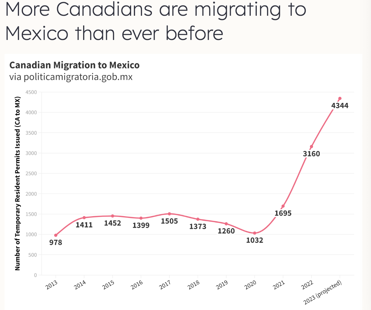 墨西哥政府的数据显示,近年来向加拿大人发放的临时居民卡(TRT)数量急剧增加。2022年,向加拿大人发放了3160份TRT,高于2021年的1695份和2020年的1032份,而2023年预计墨西哥将向加拿大人发放超过4300份TRT。