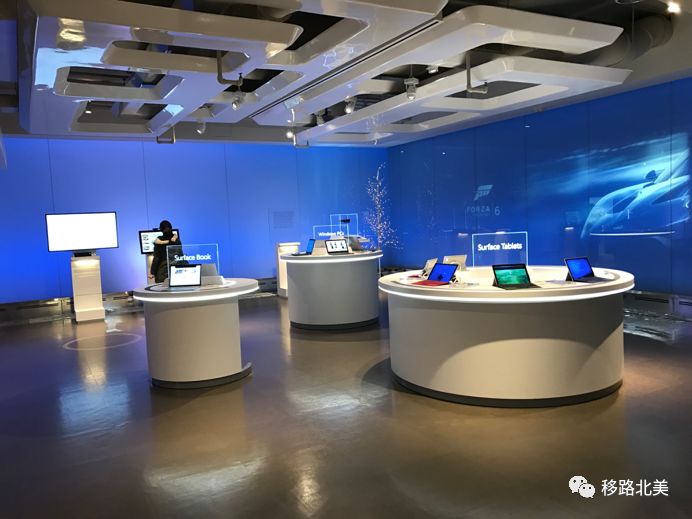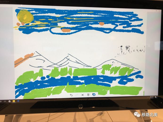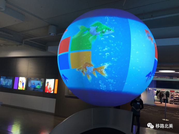 展示中心,除了一颗旋转的五彩斑斓的微软色球外,很多都是一些相关的软件和游戏及设备的展示,本来就对展示没有太大的期望,因为孩子们对于程序的概念一定是陌生而又不那么生动。可是看到一个个大屏,一个个游戏的时候,孩子们兴奋的拿着手柄,或开着赛车的游戏,或打着橄榄球的游戏,忙的不亦乐乎,这一下仿佛玩游戏成了我们鼓励的事情,不再担心我们給出的时间限制。本来想提醒他们适可而止的,想想就放手让孩子们尽兴的玩吧,于是我和妈妈开始在一个屏幕前画起了油画,其实只是装模作样,但是不一会,两个孩子还真的被吸引了过来,耐心而且享受的画起了画来…..