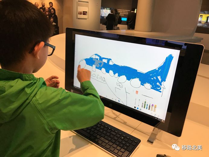 孩子们乐此不疲的尝试了各种游戏后,最后安静的看看我和妈妈画的不知所云的东西,打开电脑画起了自己这次感受的第一站——波音飞机。波音解说员说的可以改变颜色的窗户,在孩子的手下展现出来,这不正是旅行带给孩子的成长和收获吗?于是,我们每个人都安静的画起了自己的梦想。不觉中已是中午,本来这个时间我们早已经离开西雅图直奔旧金山了,可是看到孩子们这么大的兴趣,干脆就任由他们享受吧…..