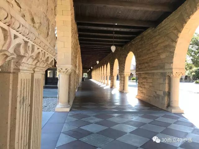 车子已开进main street,笔直的马路正对着斯坦福的主楼,棕榈树亭亭玉立,所以号称为著名的棕榈大道,记得台北大学好像也很有类似的一条主路。小路上不停的有很多跑步锻炼的年轻人,校园里显得宁静但又充满了活力。主楼前的环形草坪巨大而又整洁,加州早晨明亮的阳光铺满了整个草地,斜背后的Hoover Tower静静的伫立在不远处,俯瞰着整个校园。正对面就是最早期的教学楼,两边是著名的Main Quad 长廊,阳光洒进的部分明亮无比,则显得长廊的远处幽暗深长,仿佛时光的隧道通往远处,深邃而悠长…..