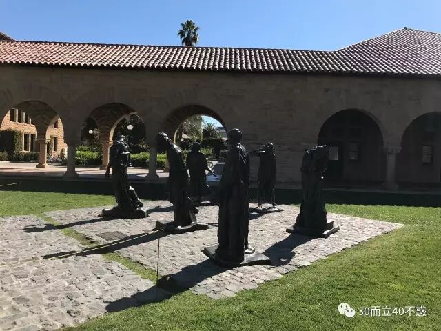 穿过长廊,当中静静的站立着六个黑色的雕像,正是法国雕塑大师罗丹的著名作品“加莱义民”,每一位神态各异,或坚定、或绝望、或听之任之……他们讲述着多年前,英军入侵加莱城后,让六位有威望的城民拿着加莱城的钥匙受降并被光着头处死,且脖子上都套着绳子…..罗丹并没有把这六位英勇献身者神话,而是真实的展现了在面对生死的时候,人们真实的一面,充分了体现了艺术来自于生活的真实写照。据说,斯坦福大学里珍藏了罗丹一半以上的作品,甚至超过了法国所珍藏的部分?