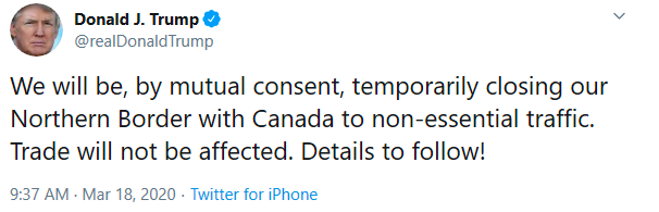 特朗普也发推文证实:“经双方同意,我们将暂时关闭与加拿大的北部边界,禁止不必要的交通。贸易不会受到影响。”