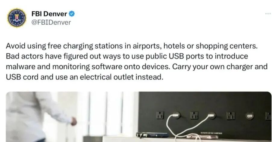 联邦调查局最近在推特上说,这些安装在机场、商场和酒店大堂等公共场所的USC充电端口是一个潜在的威胁。该推文称,"不怀好意的人已经找到了利用公共USB端口向设备引入恶意软件(malware)和监控软件的方法"。