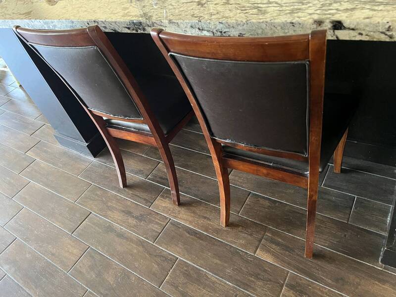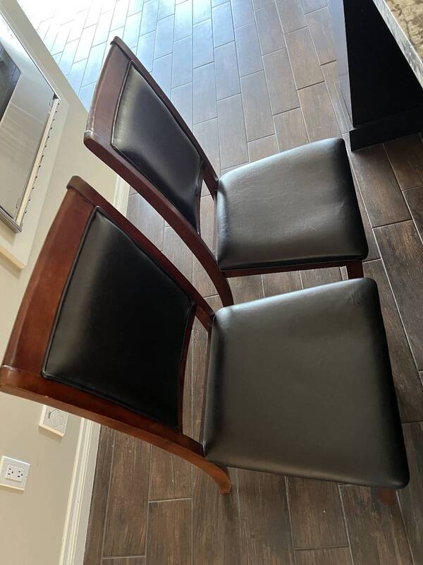 #7,棕色实木皮革餐椅2把,1把近新,1把8~9成,买一送一,$60。
