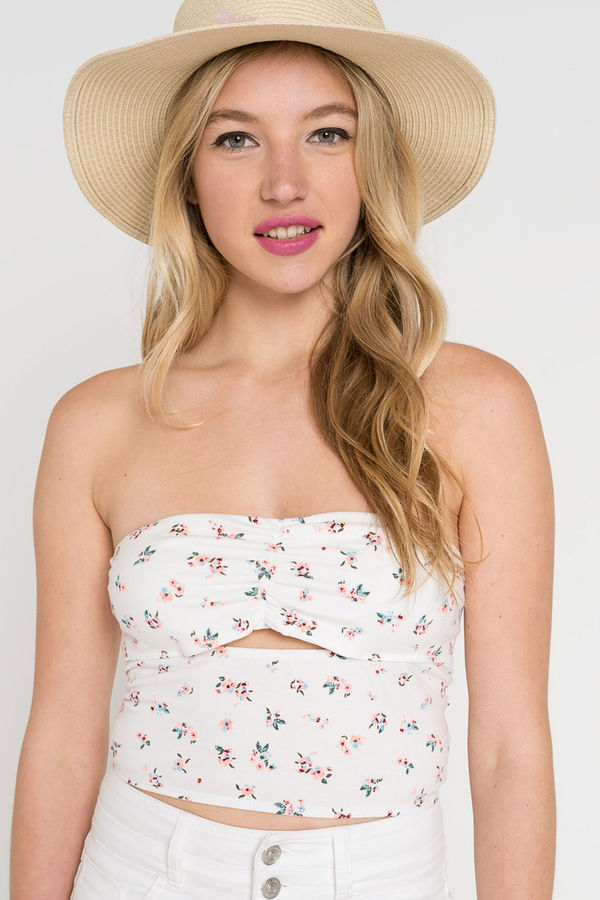 Tube crop top. Bodycon fit. Cut out at front. Elastic waist. 93% cotton, 7% spandex. Model is wearing size S.