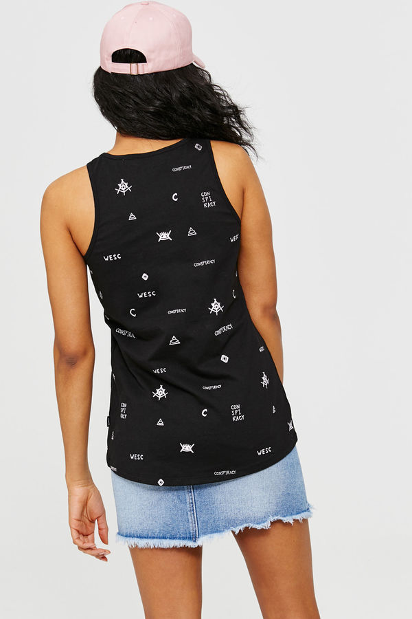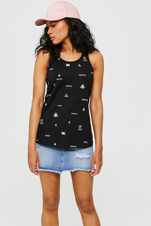 WeSC x Ardene classic knit tank top. Scoop neck. Medium straps. Graphic print. Relaxed fit. 100% cotton. Model is wearing size M.