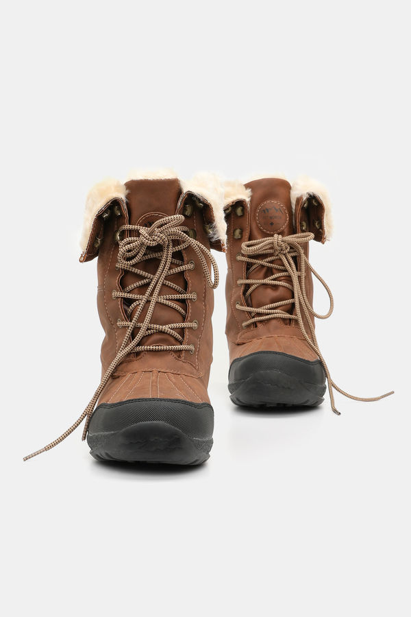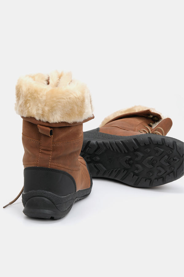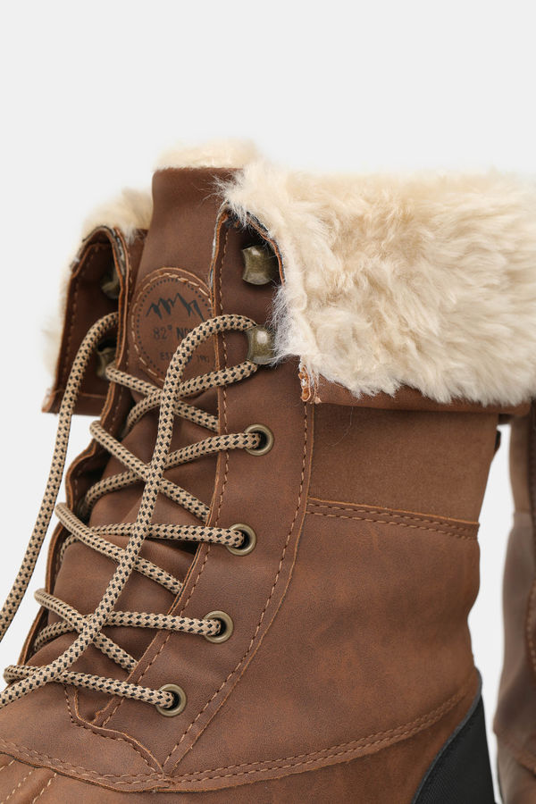 Faux leather waterproof winter ankle boots. Upper lacing. Faux sherpa lining. Snap button closures on sides. 3M Thinsulate insulation. Track rubber outsole. Lab-tested up to -25˚C.