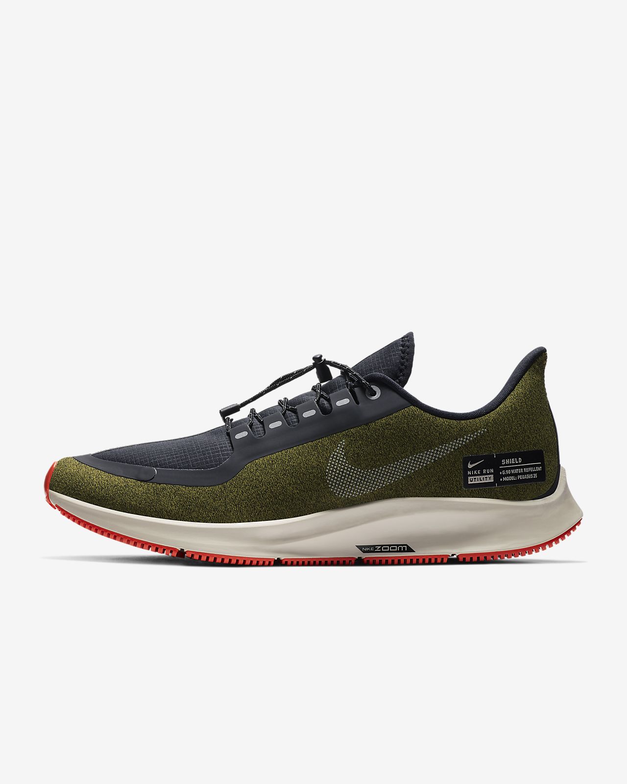 The Nike Air Zoom Pegasus 35 Shield Water-Repellent Shoe gets remixed to conquer wet routes. A water-repellent upper combines with an outsole that gives optimal grip on wet surfaces—letting you run in confidence despite the weather.