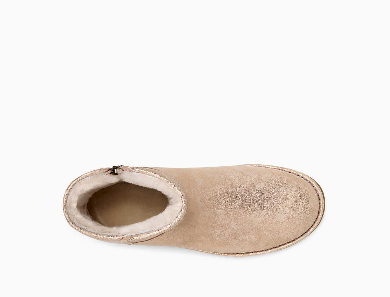 Our iconic silhouette is cast in shimmery gold suede and galaxy-inspired patterning. This boot features soft and velvety Mouton sheepskin lining, a slim profile, and lightweight sole that provides cushioning, durability, and traction. Pair with a silky slip dress for an unexpected statement.