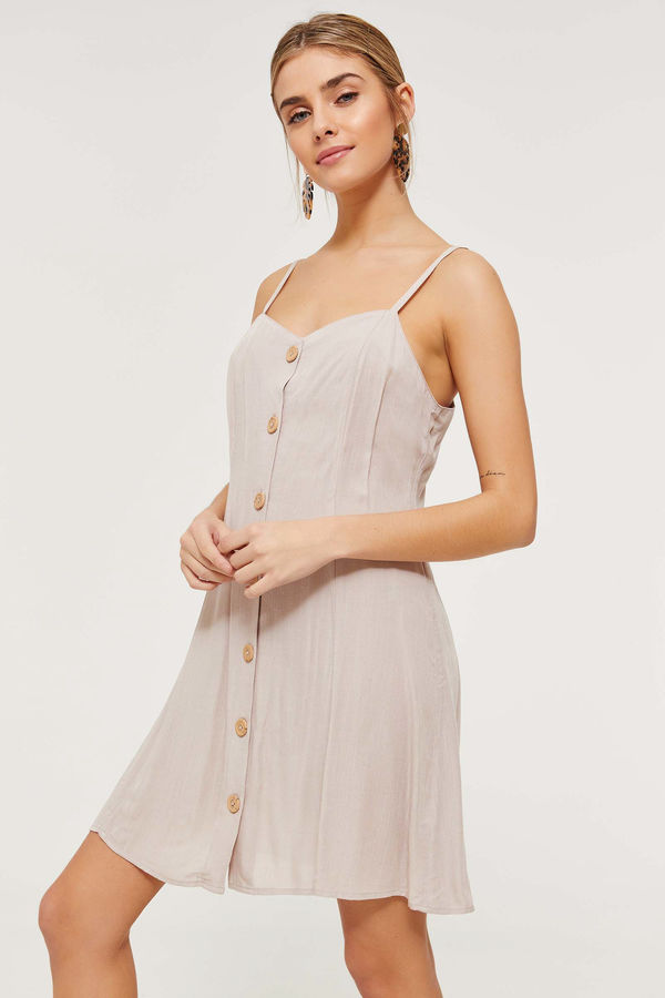 Woven mini a-line dress. Thin adjustable straps. Sweetheart neckline. Button front. Caged back. 100% viscose. Model is wearing size S.
