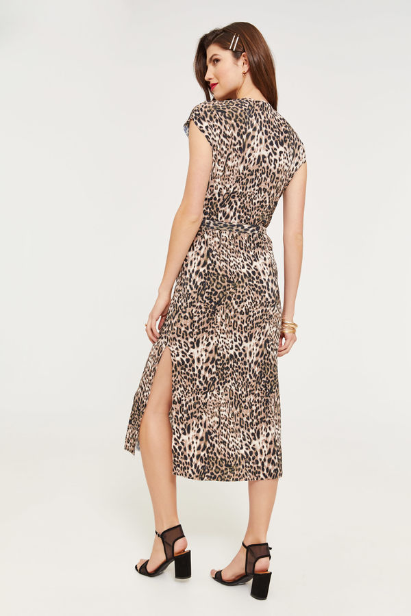 Ribbed crepe midi dress. Cap sleeves. Removable belt. Fake wrap bodice. Elastic waist. High side slits. Leopard print. 100% polyester. Model is wearing size S.