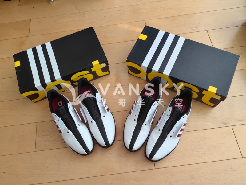 两双几乎全新的男款高尔夫球鞋。保养得相当好,使用程度仅一次下场打球时穿着,因此状况接近全新,可以说是九九成以上新。