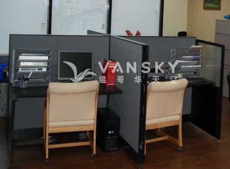 每張辦公桌長約140cm,辦公桌中間有收納櫃
