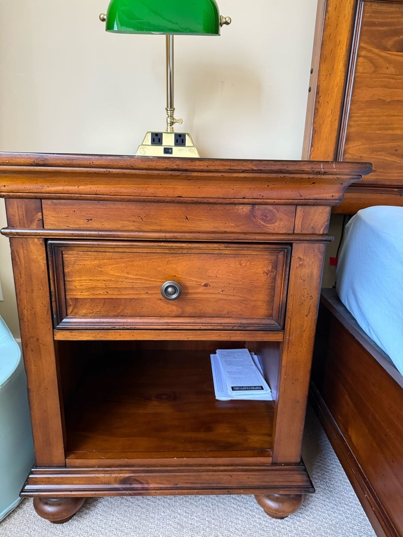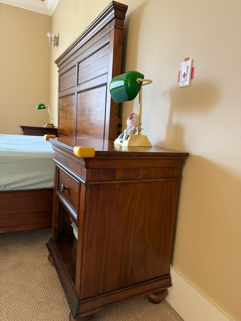 ASHELY品牌全实木Queen size床一套(床+2只床头柜),原价3000,现价1300。9成新,买来使用时间少,大部分时间处于闲置状态。质量好,实木床和床头柜都很厚重,床本身带储物空间,床尾有2个抽屉,床头两边还自带可控制的插座(见图),方便插床头灯或者手机充电。
