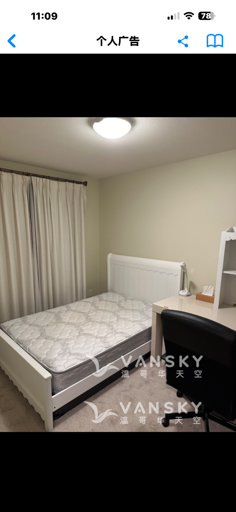 列治文市中心公寓睡房+书房(可作睡房),带独立卫浴,提供所有家具,床,书桌,桌灯,落地灯,椅子,边桌,书架等,只需拎包入住,单位环境整洁、温馨、无比宁静! 可1-2人入住,适合夫妻、情侣、父/母与子/女、朋友等。