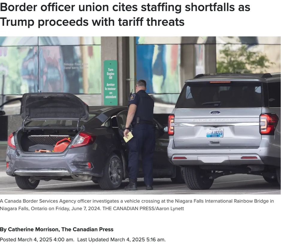 从今天(3月4日)起,美国宣布加拿大开征25%关税,特鲁多同时宣布匹配反制,代表加拿大一线海关和移民官员的联邦工会表示,贸易战开打,他们对加拿大边境服务局的CBSA官员配备水平感到担忧。