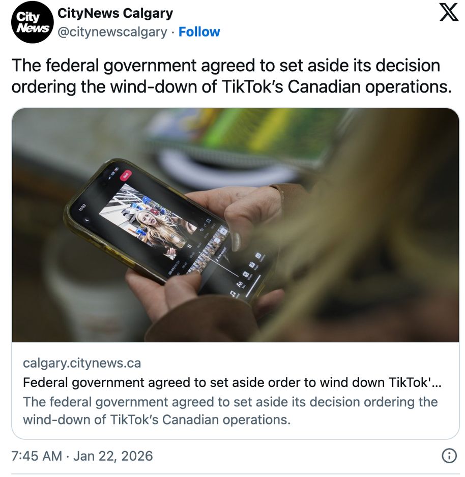 据路透社报道,加拿大联邦法院1月21日周三推翻了政府要求关闭TikTok加拿大业务的命令,允许这款短视频应用暂时继续运营,并要求加拿大政府重新审查该案。  2024年11月,加拿大工业部以国家安全风险为由下令关闭TikTok的业务,但同时补充称,政府并未封禁该应用,也未限制用户创作内容。TikTok随后提起上诉。 加拿大联邦法院法官拉塞尔·津恩(Russel Zinn)在一份简短判决中撤销了该命令,并将此案发回工业部长拉妮·乔利(Melanie Joly)重新审查。 他未给出任何理由。 TikTok发言人对这一裁决表示欢迎,并表示公司期待“与乔利部长合作以达成解决方案”,并补充称该应用在加拿大拥有超过1400万用户,约占该国人口的三分之一。 “保留TikTok加拿大团队的运作,将为我们继续支持在加拿大的数百万美元投资和数百个本地工作岗位铺平道路。”TikTok发言人称。 另据彭博社报道,加拿大法官暂时搁置此前要求TikTok逐步关闭业务的命令,允许该应用继续运营其在加拿大的子公司,这一做法显然得到了政府的默许。 此项裁决是在加拿大政府就TikTok上诉案件提出动议后作出的,法院在裁决中“注意到双方都对此表示同意”。 目前,加拿大总理卡尼一直在寻求与中国建立更紧密的关系,以帮助抵消美国关税对加拿大经济造成的影响。卡尼最近访华,并降低关税进口4.9万辆中国电动汽车。