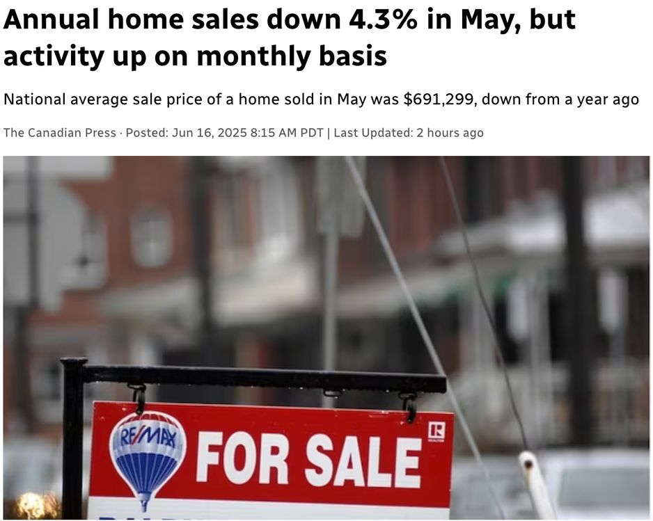 加拿大房地产协会(CREA)表示,2025年5月全国房屋销售量比去年同期下降了4.3%,但环比出现3.6%的增长,这是半年多来首次月度回升。 CREA高级经济学家肖恩·卡斯卡特指出,在多数买家上半年持观望态度后,近期市场活跃可能只是之前因政策不确定性而延迟的回暖。 同时,新挂牌房源数量也环比增长了3.1%。截至5月底,全国挂牌房源总数为201,880处,比去年同期多出13.2%,但仍低于同期平均值5%。 全国平均房价为691,299加元,较去年同月下跌1.8%。 蒙特利尔银行经济学家罗伯特·卡夫西克表示,虽然市场整体仍显疲软,但并未进一步恶化,且建筑活动仍在继续。他指出,尽管贸易局势趋于稳定、政治前景更加清晰,有助于提升信心,但高企的抵押贷款利率仍是阻碍购房能力和投资热情的主要因素。 整体而言,全国房地产市场仍面临销量和价格双低的局面。