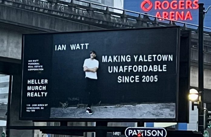 一名地产经纪因挂上一个讽刺温哥华房价过高的广告牌而受到恐吓。 禾特(Ian Watt)是Heller Murch Realty的一名地产经纪,在温哥华市中心罗渣士体育馆(Rogers Arena)外一幅写上「伊恩禾特 自2005年以来使耶鲁镇变成居民不可负担的地方」(Ian Watt Making Yaletown Unaffordable since 2005)的广告牌,正是出自他的手笔。 广告牌上有他悠然自得的样子。 这块广告牌上的句语在社交媒体上引来一些人反感,指责这广告牌麻木不仁,而且是在取笑那些无法负担住在耶鲁镇的人。 其中一名网民周五发文批评说:「从房屋危机中赚取暴利是一回事,但花钱在广告牌上宣扬这事委实令人反感。」 据1130新闻电台报道,禾特解释这广告牌的用意在于讽刺,更声称自从广告牌挂出后,由于受到恐吓,因此他被迫关闭了社交媒体Instagram上的留言功能。 他说:「现实是政府容许楼房像股票一样投机买卖了这么多年,而不是留作市民居住之用。」 禾特续道:「现在由于政府的不作为,对于那些没有父母以财力支援的年轻人来说,楼房已变得不可负担了。」 他认为人们应该把注意力集中在问题上,而不是指出问题的人。 他坚持自己所言非虚:「我对年轻人在耶鲁镇面对的经济现实的说法是诚实的。」