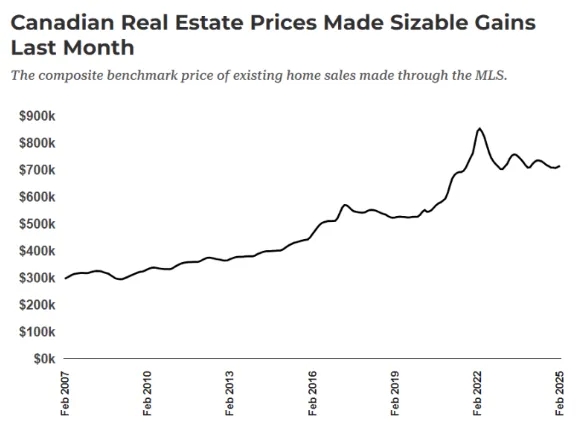 尽管需求进一步下降,加拿大房价仍在继续加速增长。加拿大房地产协会 (CREA) 的数据显示,2 月份房价上涨。房价上涨的同时,销售额却出现了多年来的最大降幅,这进一步缓解了库存压力。这并非传统情况。 上个月,加拿大现房价格继续上涨。2 月份,基准(或典型)房屋价格上涨了 0.6%(+4400 加元),达到 71.37 万加元。与去年同期相比,房价下降了 1.0%(-6900 加元),但变化可能即将出现。 图源:CREA   年增长率进一步进入亏损区间,但这是由于 12 个月窗口期的变化造成的。去年此时的下行压力已开始减弱,掩盖了近期的加速趋势。最近的数据显示短期加速,3 个月(年化)增长率明显高于年增长率。这也比去年同期高得多--去年同期没有关税威胁,人口增长较快,销售额也更高。 图源:CREA   由于短期加速先于年增长率的上升,这表明上升压力在增加。在基本需求受到侵蚀的背景下,这有点令人费解。 加拿大房屋销售量创下多年来最大降幅,库存保持稳定 加拿大房地产需求持续减弱。CREA 特别指出,经季节性调整后,2 月份的月度销售量下降了 9.8%,这是自 2022 年 5 月加息之初以来的最大降幅。该行业专业团体将此归因于 “关税的不确定性”,但值得提醒的是,这种不确定性推高了房价。 2 月份未经调整的年增长率(-10.4%)显示,房屋销售放缓的速度与贸易战宣布前相似。市场上的买家也支付了更高的价格,他们很可能认为利率下降会推高 3 月份的房价。除了关税带来的不确定性外,还有其他原因。 市场通常不会出现价格上涨、销售疲软和库存增加的情况。业内人士将这一奇怪的组合归因于关税的不确定性,但更高的价格表明这更像是房价的上涨。 许多消费者对本月的降息早有预期。利率下降通常是经济疲软的标志,但在大流行病的低利率冲击之后,似乎预示着投机性增长。那些期待更便宜的信贷引发需求激增的人将会失望。上次降息刺激了通胀预期,增加了抵押贷款利息成本。