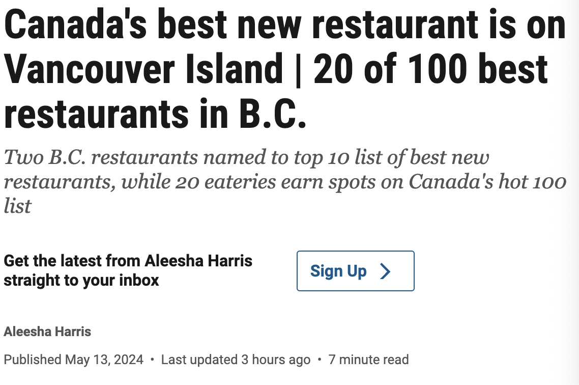 这家由 Aquilini 家族的 Top Table 餐饮集团拥有的温哥华岛餐厅在去年全国新开业的 10 家最佳餐厅中名列榜首。